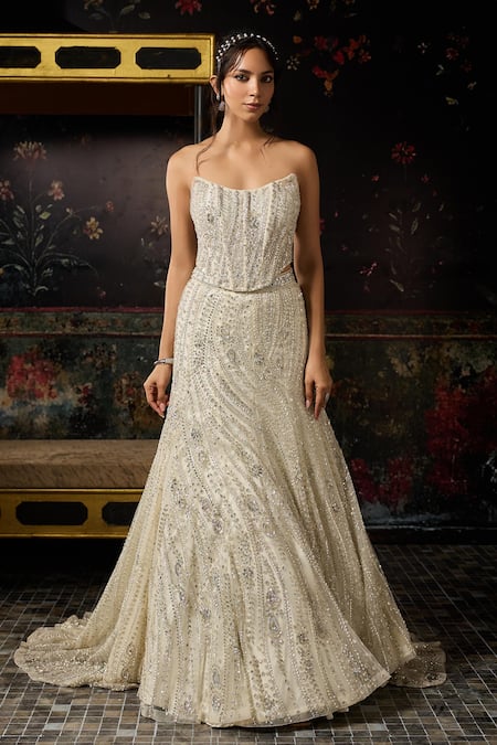 Silver Tulle Sequins, Beads, Embroidery Embellished Corset And Mermaid Lehenga Set