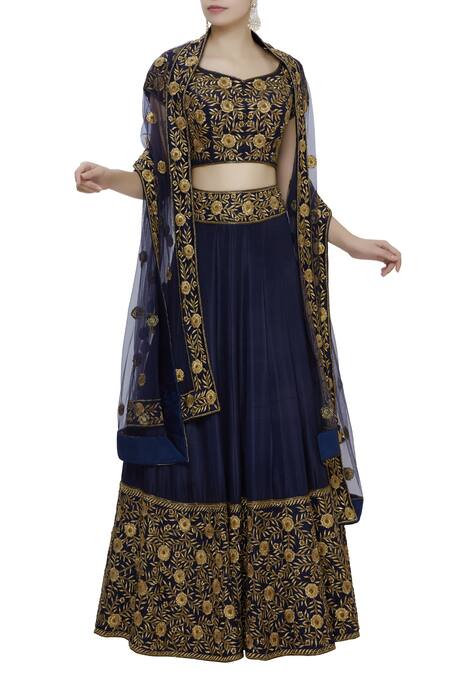 Floral gold embroidered blue-hued lehenga. Comes with heavy embroidered blouse & dupatta.