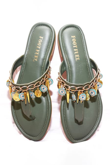 Green flats featuring charm embellishments, chain detailed strap, and split toe