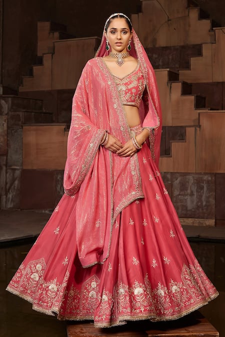 Pink Silk, Organza Embroidery Sweetheart Neck Plumeria Bridal Lehenga Set