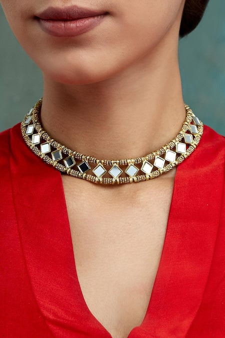 Gold choker featuring finely cut mirror embellishments in casting metal