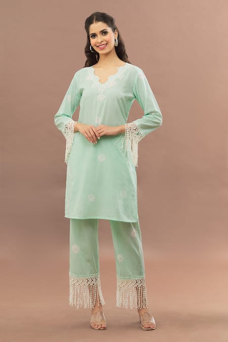 Buy_Kalakaari By Sagarika_Green Cotton Lace Cut Work Kurta With Pant_at_Aza_Fashions