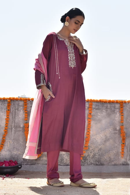 Maroon straight kurta featuring hand embroidered floral motifs and side pockets. Paired with churidar pant and a coordinating dupatta.
