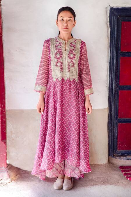 Buy_Myoho_Pink Cotton Silk Kathiawadi Embroidered Kurta_at_Aza_Fashions