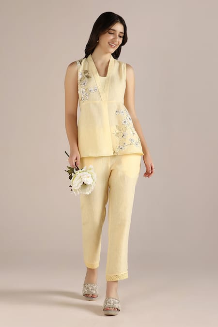 Yellow Linen Embroidery V-neck Camelia Floral Print Top