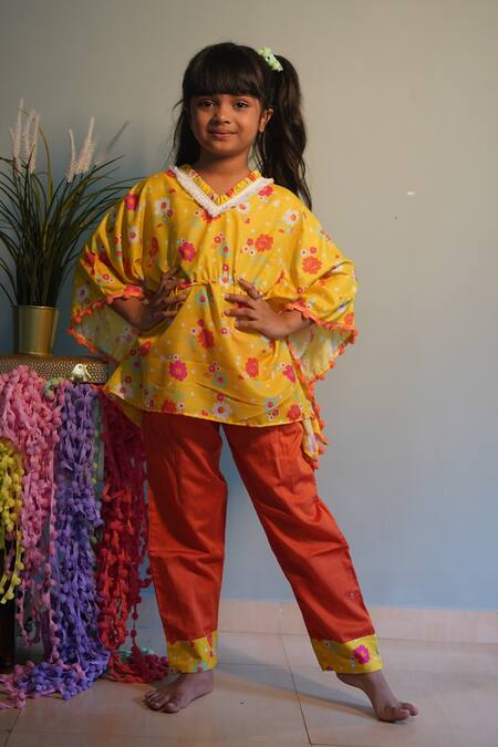 Buy_Kirti Agarwal - Pret N Couture_Yellow Modal, Cotton Pom-poms Flower Print Kaftan And Pant Set _Online_at_Aza_Fashions