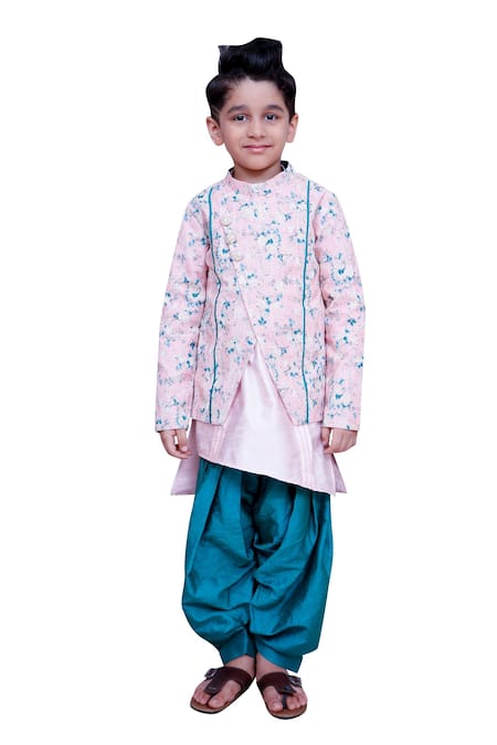 Blush pink kurta featuring a mandarin collar and side button placket. Paired with a floral printed cut nehru jacket and green salwar.
