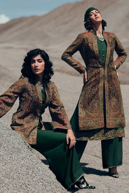 Bottle green kurta featuring paisley and floral embroidered hem. Paired with a woven thread weave jacket, palazzo, and scarf.