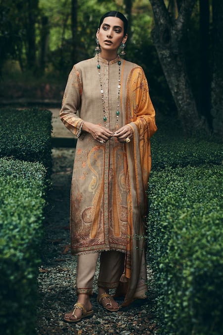 Grey Viscose Pashmina Printed Digital Mandarin Collar Paisley Kurta Set