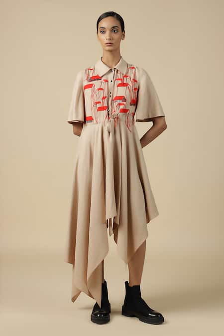 Beige asymmetric dress featuring intricate tiny houses embroidery and drawstrings on the waist