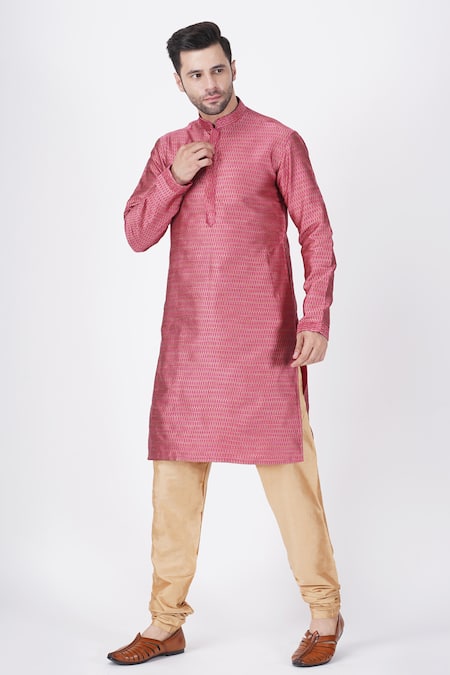 Pink kurta featuring floral jacquard woven motifs and dori embellishment on the collar. Paired with a churidar pyjama with an elasticated waistband.