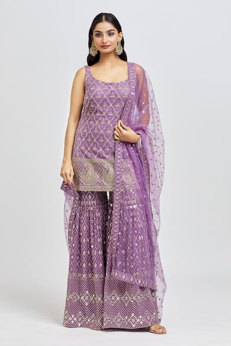 Purple kurta featuring all-over quatrefoil embroidery with sequins, zari, and foil work. Paired with a matching sharara and dupatta adorned with similar embellishments.