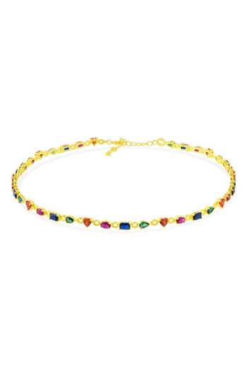 Gold choker necklace featuring multicolored cubic zirconia gemstones