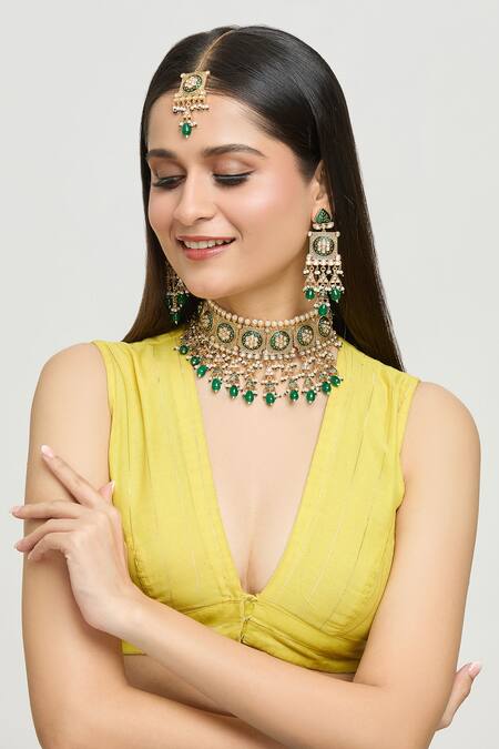 Gold surya pakhi design choker necklace featuring green Meenakari and kundan encrustments. Accompanied by a pair of dangler earrings and a maangtikka.