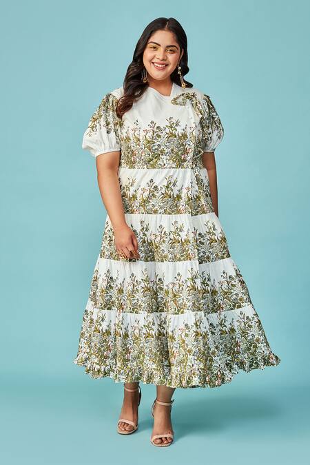 Ivory overlap flared maxi gown with gathered tiers, multi-color floral motif print & side tie-up.