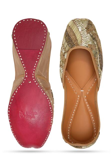 Antique gold leather juttis featuring a pointed toe and intricate sequin and bead embellishments.
