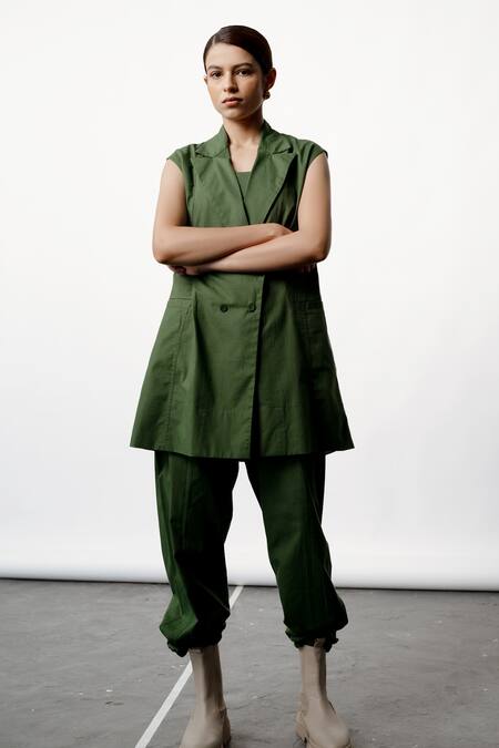 Sage green sleeveless jacket made from cotton linen featuring a lapel collar