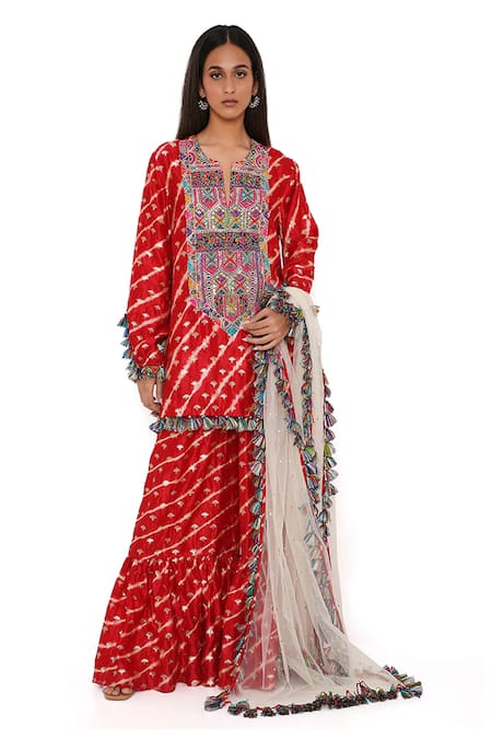 Buy_Payal Singhal_Red Silk, Net Bandhani, Leheriya Pattern Notched Kurta Sharara Set _Online_at_Aza_Fashions