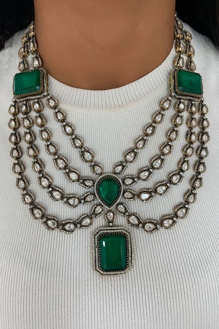 Buy_PRERTO_Emerald Green Stones Kundan 3-layer Necklace Set _at_Aza_Fashions