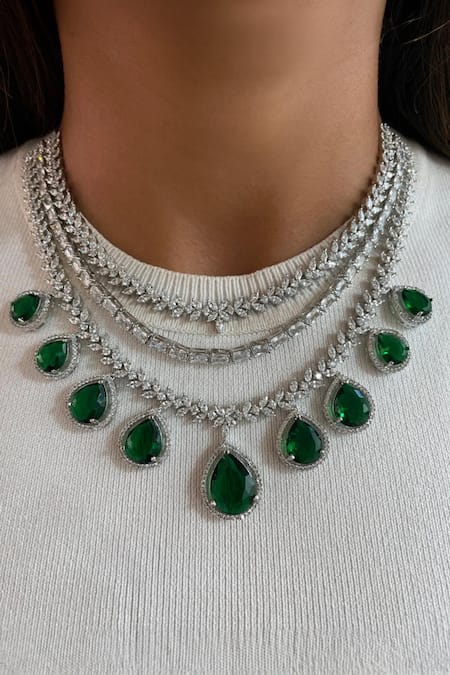 Green Diamonds, Stones Three-layered Emerald Teardrop Embellished Necklace Set