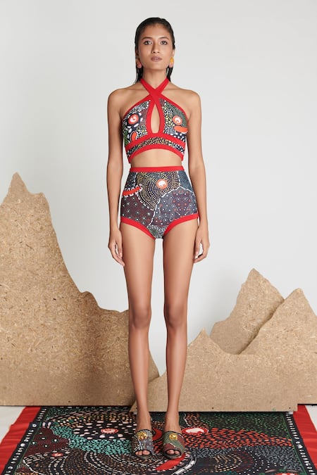 Red and green halter bikini top with cutout detail in the front. Comes with high-waist bikini bottom.