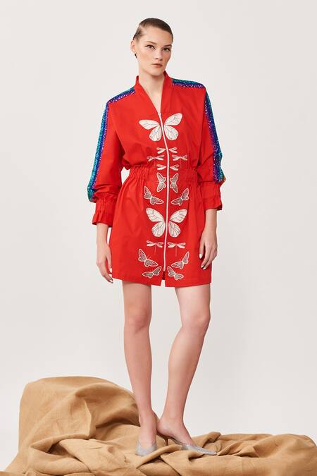 Red jacket dress with rainbow panels, butterfly embroidery & elasticated waist.