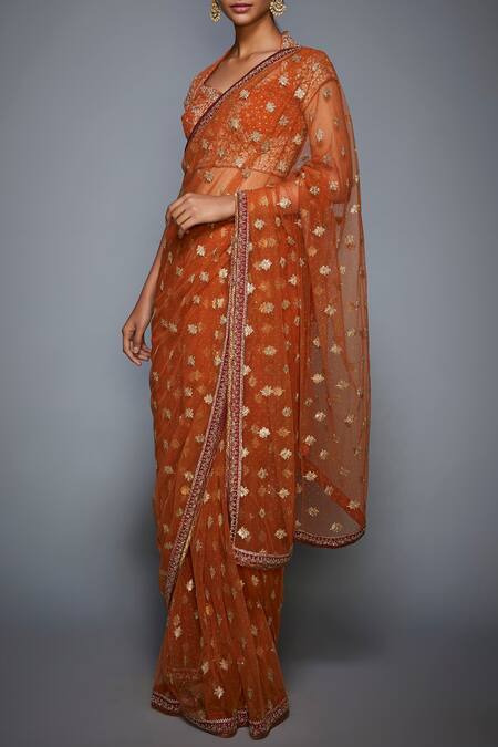 Rust net saree with zardozi embroidered motifs. Comes with unstitched blouse.