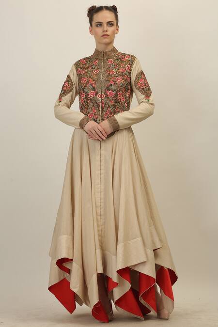 Let your twrill game be on point, wear this gold asymmetric layered kurta. It is accentuated with multicolor silk thread & zari embroidery on the front.