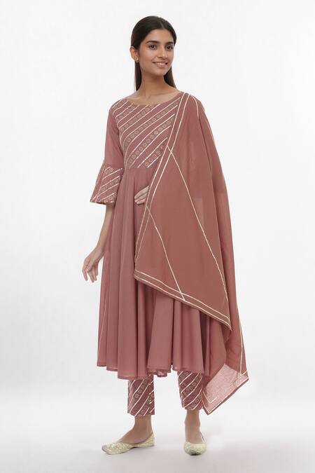 Brown Cotton Gota Patti Round Neck Mauve Embroidered Anarkali Set