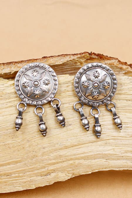 Silver Plated Cut Work Carved Circular Dangler Earrings