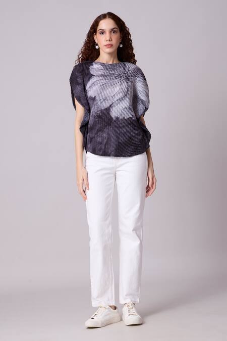 Grey kaftan style top featuring a floral motif with a high neckline and half sleeves