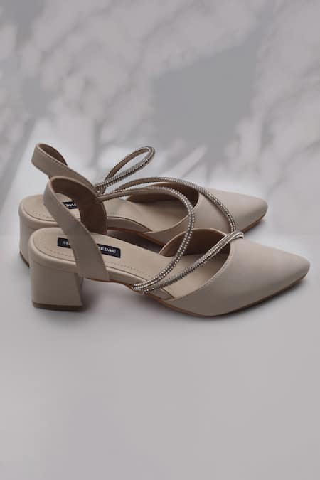Beige rexine block heels featuring stone embellishments and a 2-inch heel height