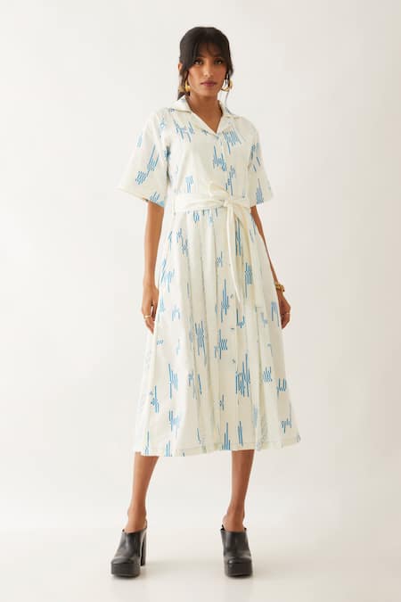Off White Cotton Satin Print Carnival Collared Miyoko Dress