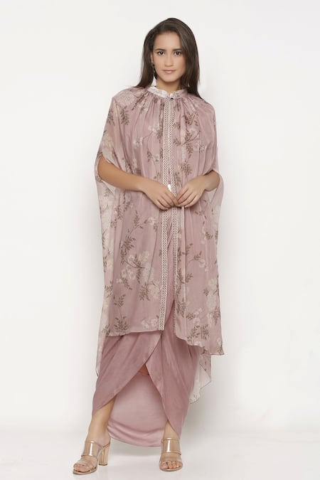Pastel pink overall floral motif print & minimal embroidery detailed cape. Comes with draped pattern dress.