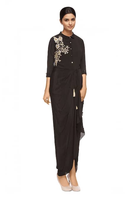 Black draped dress with floral embroidered detail & front tie-up.