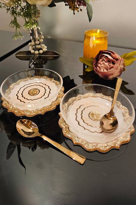 Pink and rose gold set of 2 dessert bowls with flower carved bottom.