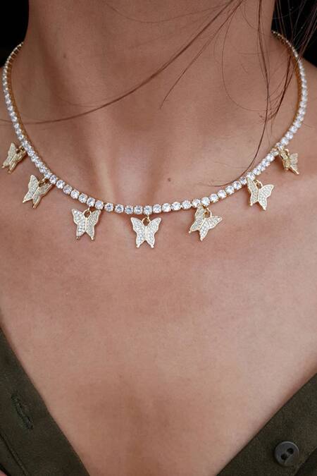Silver toned necklace embellished with yellow round crystal, butterflies.