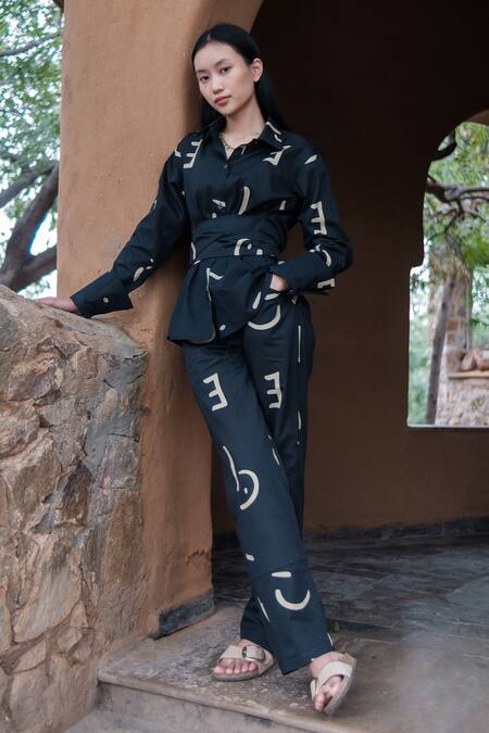Buy_The Terra Tribe_Black Organic Cotton Printed Line Collar Nara Front Knotted Shirt_Online_at_Aza_Fashions
