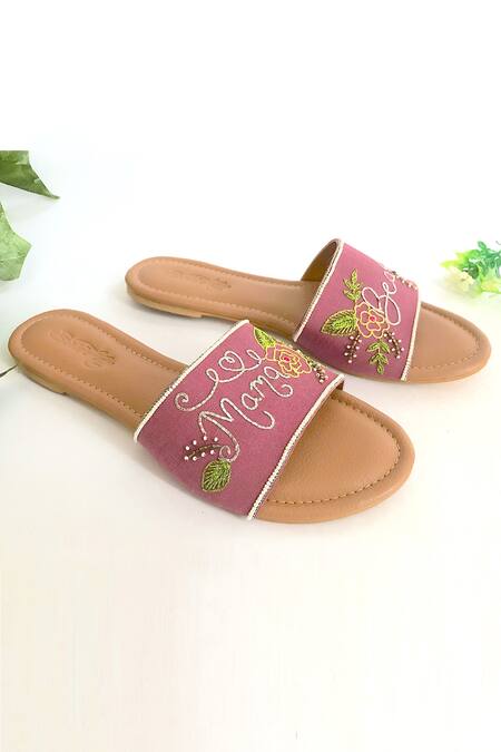 Purple sliders featuring slogan bead work and floral motif nakshi embroidery