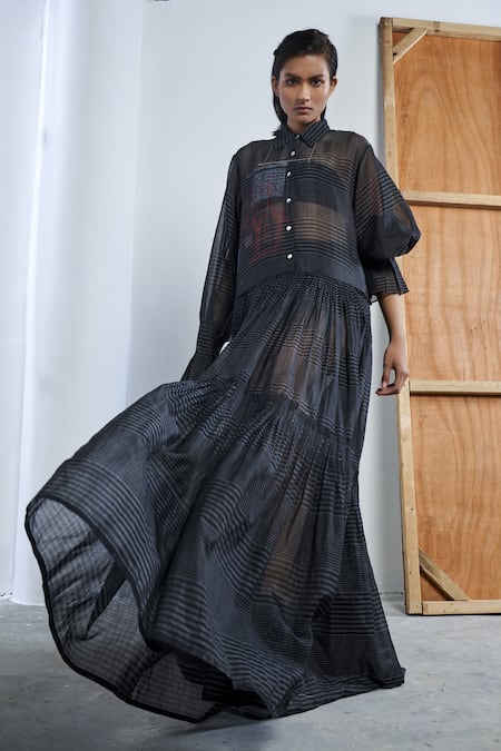 Black Chanderi Silk Collared Striped Sheer Tiered Dress