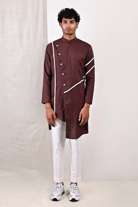 Dark mahogany asymmetric kurta with contrasting panel. Paired with off-white pant.