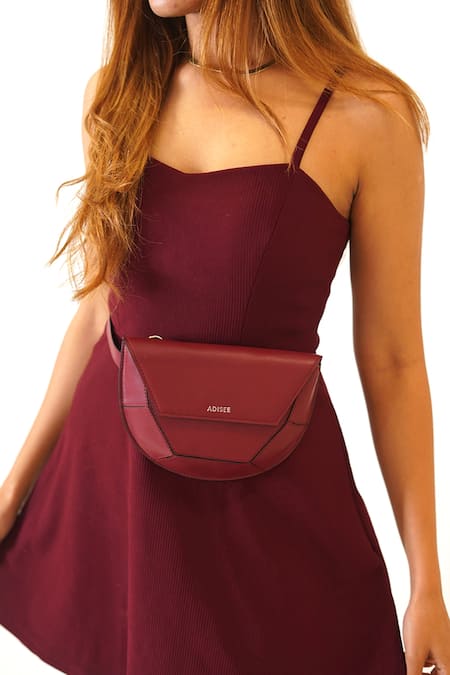 Maroon leather handbag featuring a three-dimensional geometric structured design. Includes an interior slip pocket and can be used as a crossbody, belt bag, or fanny pack.
