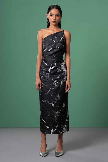 Black midi dress featuring a one shoulder design with an all-over galaxy print and pleated foldover bodice detailing