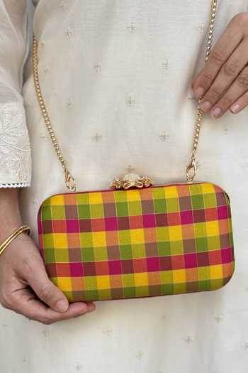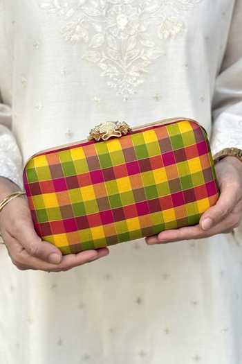 Multicolor Yaazhi Silk Kattam clutch featuring a reimagined checkered Kattam pattern and artisanal craftsmanship. Designed for the modern woman who appreciates traditional heritage and contemporary chic.