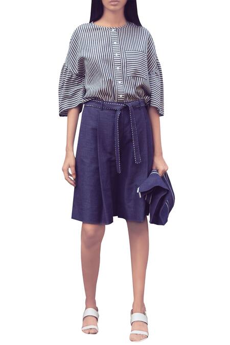 Modern and feminine, this gathered sleeve striped pattern blouse is the perfect summer essential. It is crafted in breathable and luxe hand-woven cotton fabric. This blouse is designed with gathered sleeves and a round neckline, finished with bias binding. Style this top with high waisted trousers, and you re good to go!