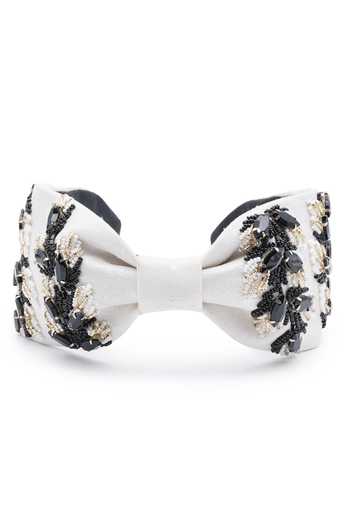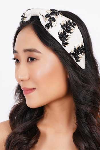 White and black handmade beaded top-knot headband with rhinestones, metallic thread and intricate embroidery. Handcrafted by artisans with an anti-slip grip and one-size-fits-all design.