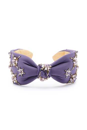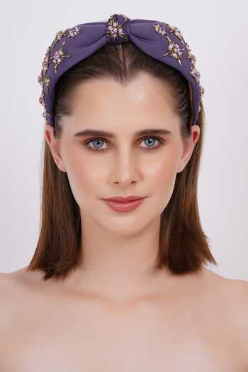 Purple headband adorned with rhinestones, bugle beads and intricate embroidery. Handcrafted in cotton fabric with an anti-slip grip and one-size-fits-all design for comfortable all-day wear.