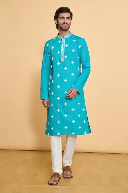 Buy_Arihant Rai Sinha_Blue Cotton Embroidery, Sequins Floral Straight Kurta Set_at_Aza_Fashions