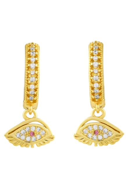 Gold dangler earrings featuring an evil eye charm embellished with stones