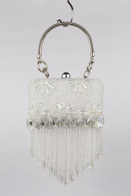 White handbag featuring crystal embellishments and tassels